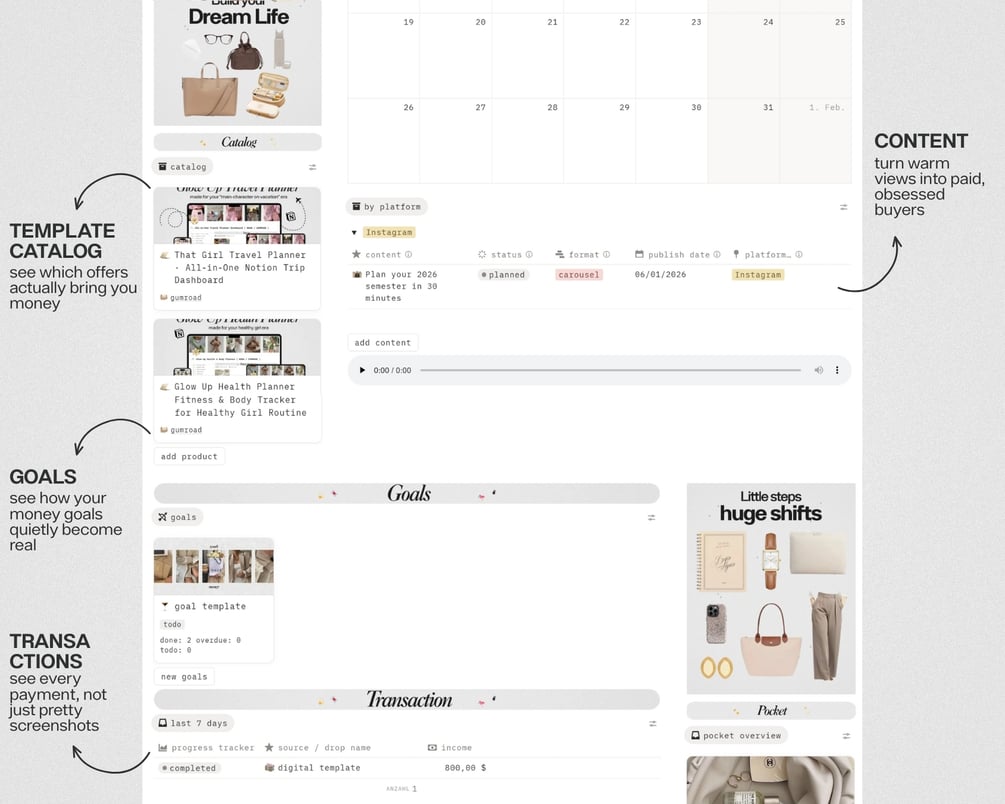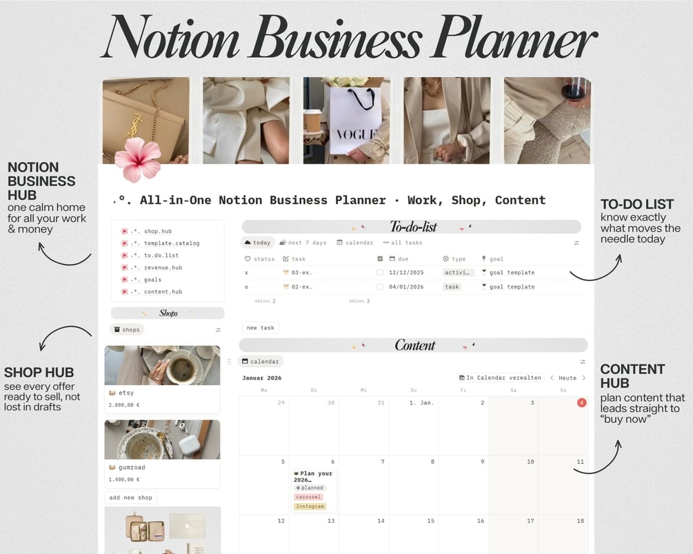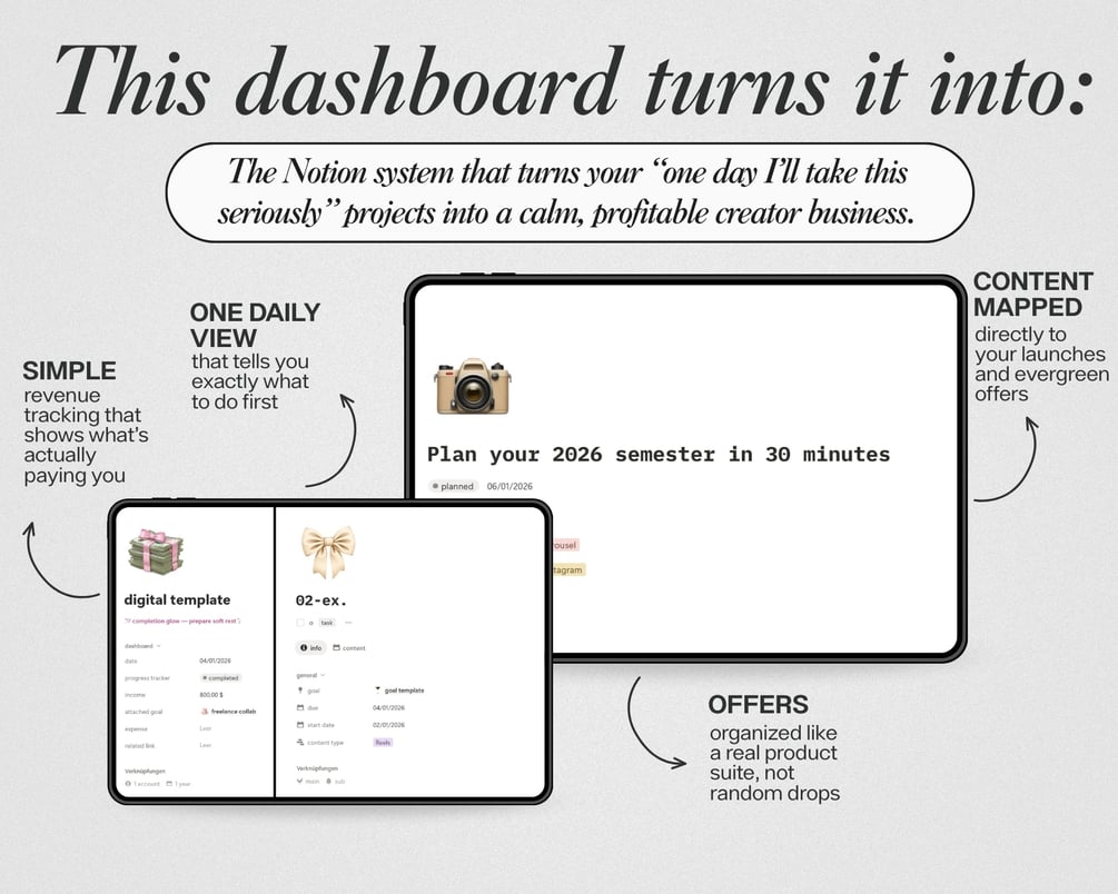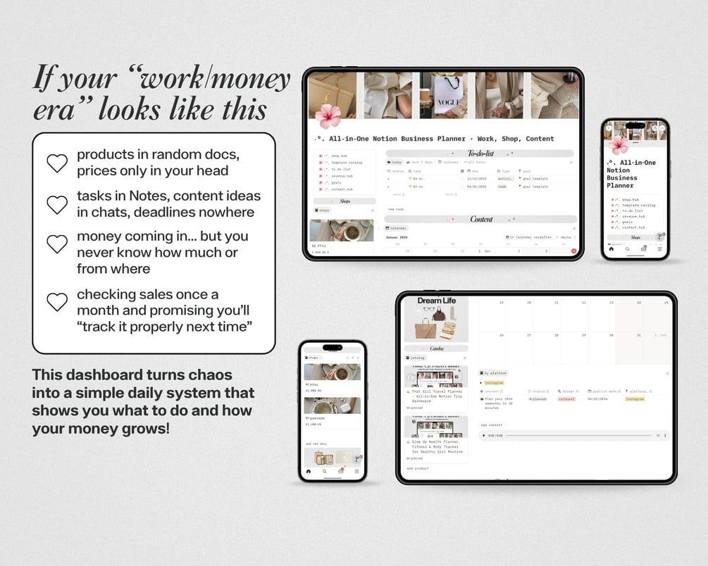 This all‑in‑one digital business planner replaces scattered apps, random sheets and “I’ll remember it” notes with one clear Notion dashboard for your offers, tasks, content, goals, transactions and yearly money overview — so you finally see what actually grows your income every single week.