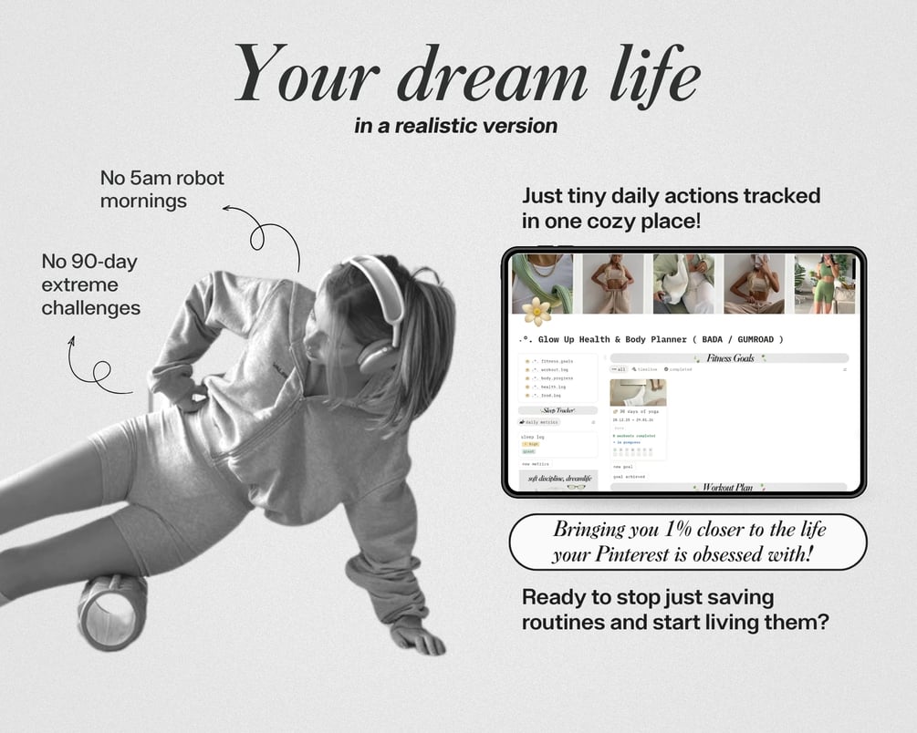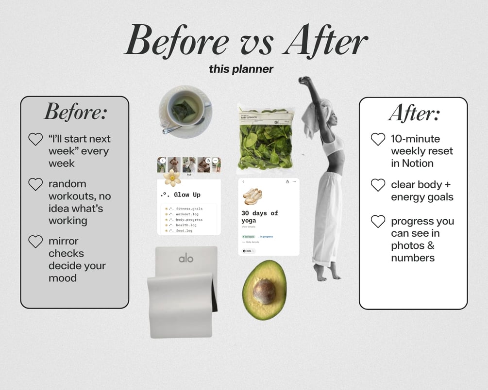 The Glow Up Health & Body Planner is your ultimate Notion template for wellness, fitness and body progress — one system that finally does it all right.