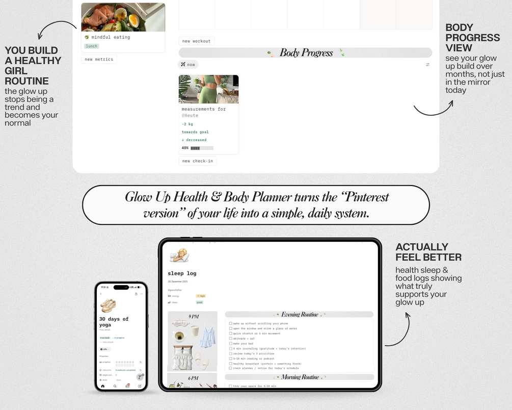 Glow Up Health Planner Notion Template | All‑in‑One Wellness, Fitness & Body Tracker for Healthy Girl Routine