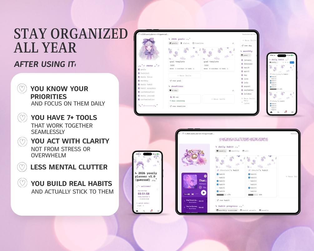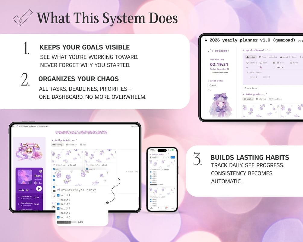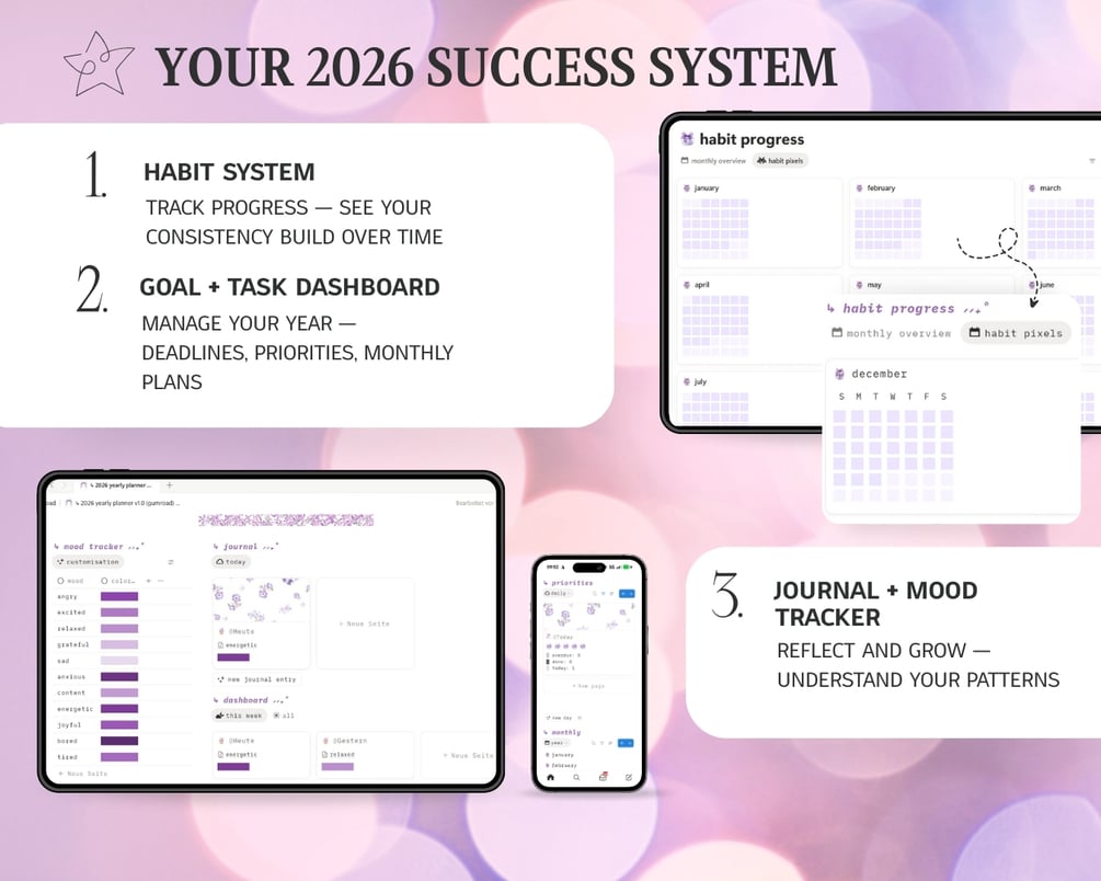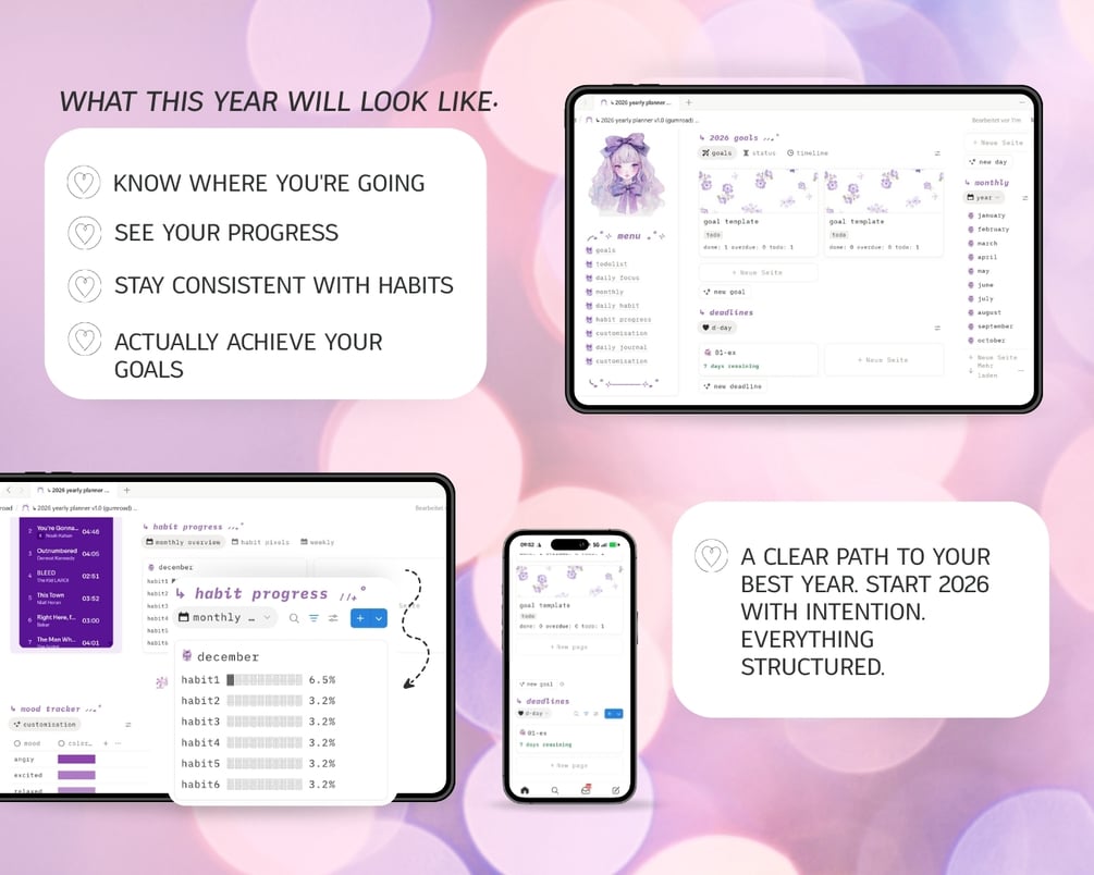 Complete 2026 life planner system with goals tracker, daily habits, to-do lists, monthly planning, journal and mood tracker. Purple aesthetic Notion template.