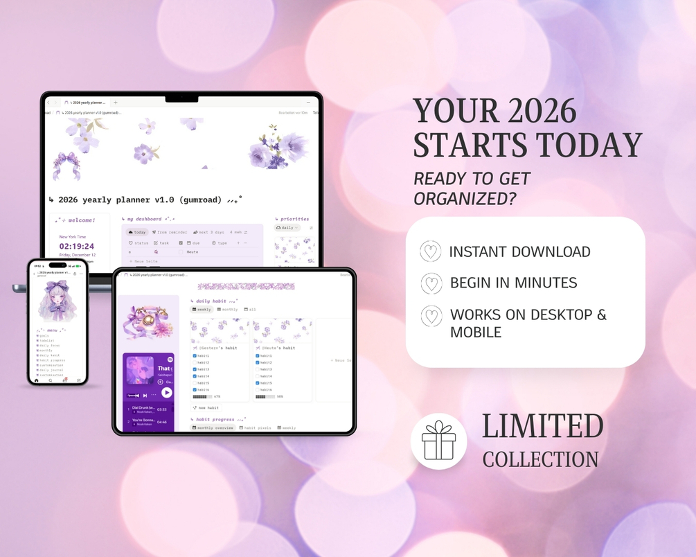 Stop feeling overwhelmed by scattered goals, forgotten tasks, and broken habits. This all-in-one yearly planner gives you everything you need to organize your entire 2026 in one beautiful, aesthetic space.