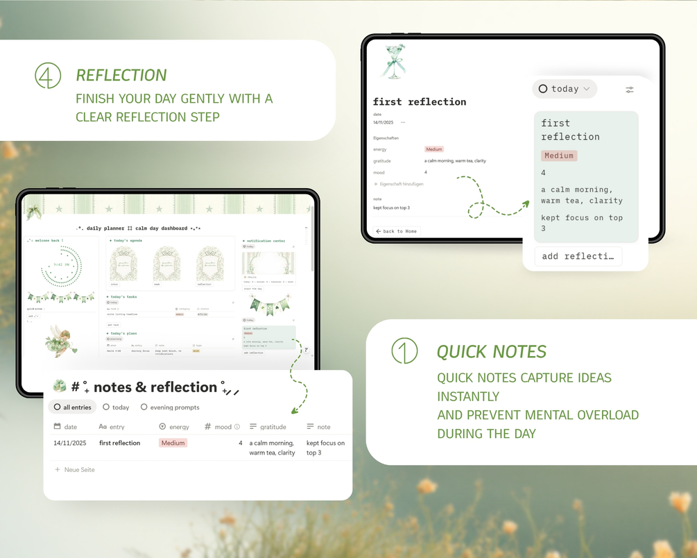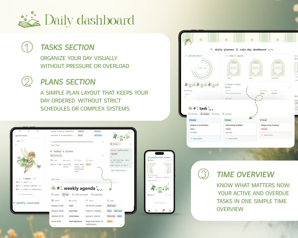 Daily Calm Planner | Simple One-Page Notion Template for Students | Green Edition | Aesthetic Daily Dashboard