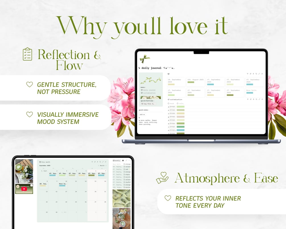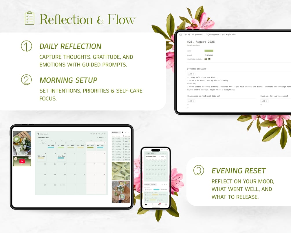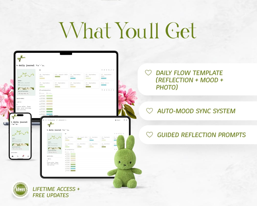 Green & White Daily Journal | Guided Notion Template for Mood Tracking & Mindful Reflection | Aesthetic Self-Care System
