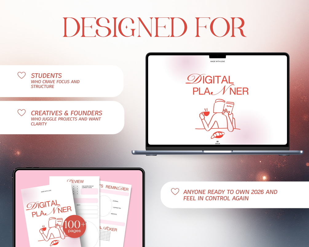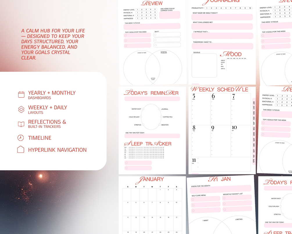 Daily dashboards, reflection pages, habit trackers & gentle guidance turn productivity into a self-care ritual.