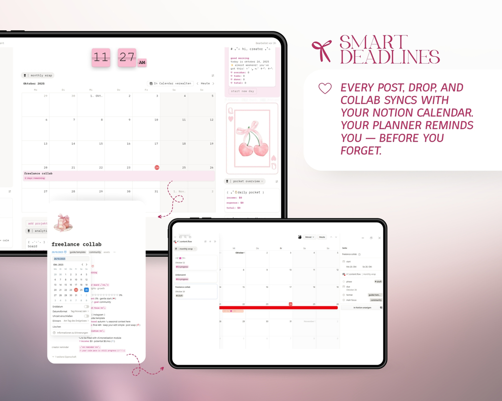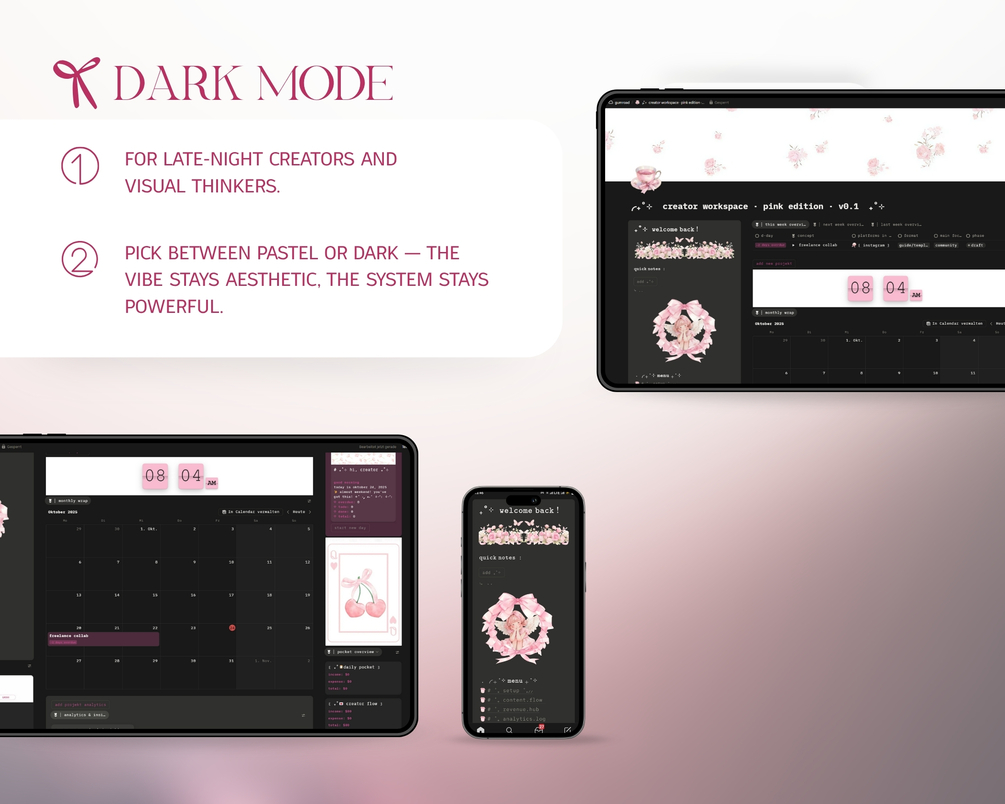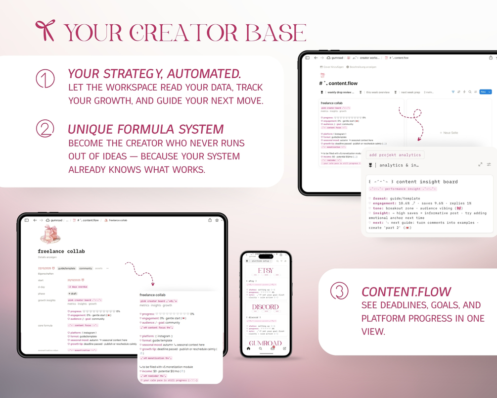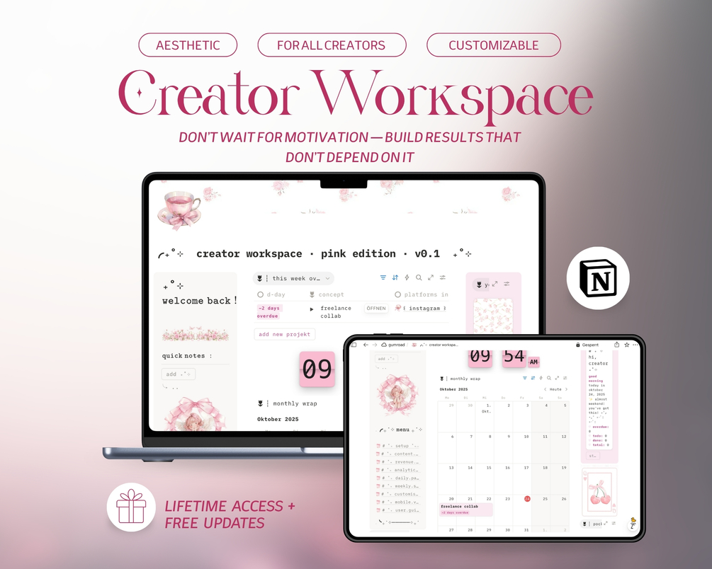 notion creator template Β· content creator planner Β· social media planner notion Β· notion content calendar Β· creator dashboard Β· analytics tracker notion Β· revenue tracker for creators Β· freelance workspace notion Β· multi-platform content planner Β· creator income tracker Β· notion template for influencers Β· aesthetic creator planner Β· pink notion template Β· all-in-one creator system Β· content organization notion