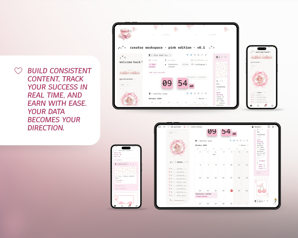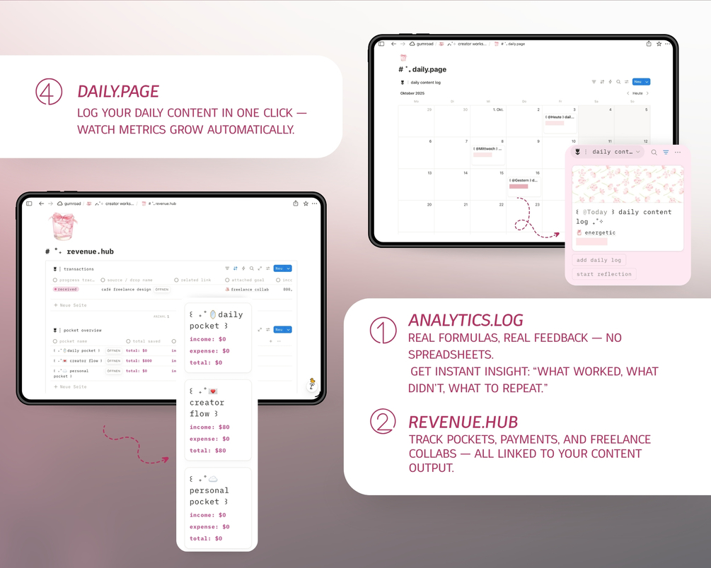 Creator Workspace | All-in-One Notion Template for Content Creators & Freelancers | Pink Edition | Analytics + Revenue Hub